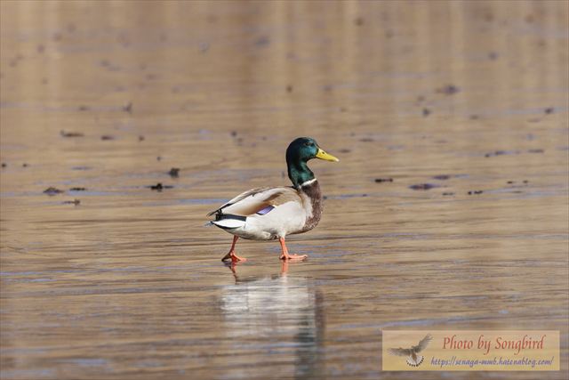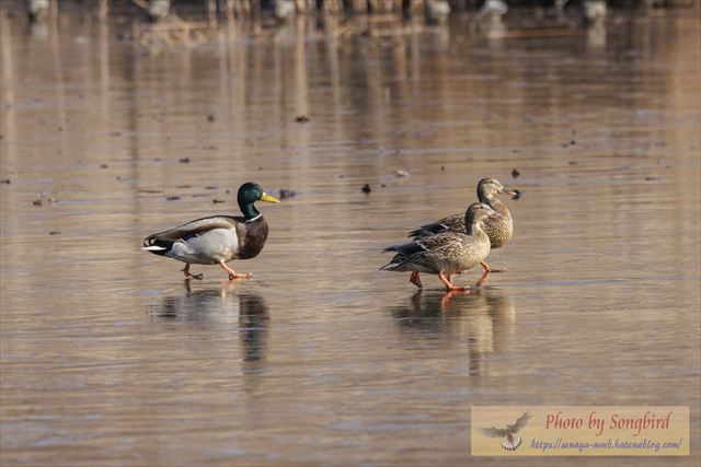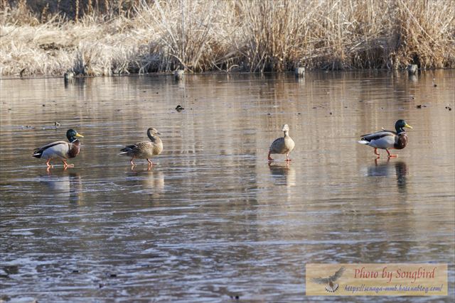 そんな中、どこかからマガモが4羽飛んできて、着水しようとしても・・・・一面の氷。何とか器用に滑らず着氷したものの、立つ姿もおっかなびっくり!