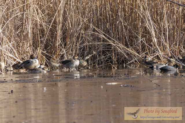 一方、オカヨシガモやヒドリガモなどは、遠く離れた茂みの近く狭い氷が解けた場所に集まってますが、トモエガモの姿は確認できず。