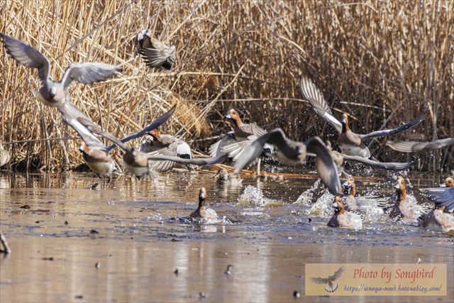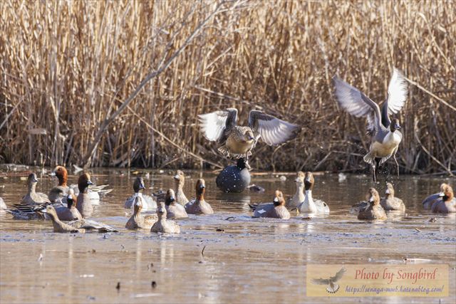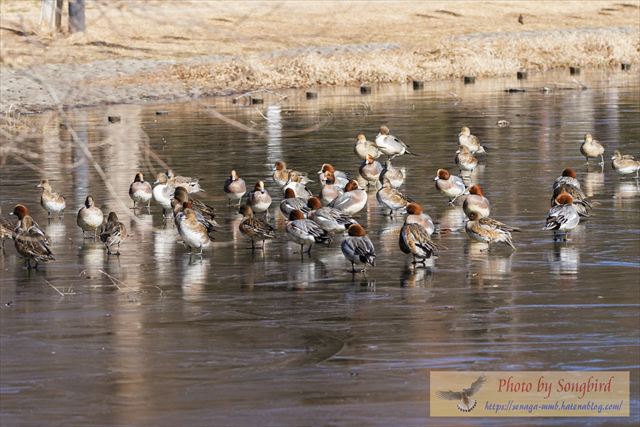 着水予定の場所は、まだ一面の氷。ヒドリガモ達はなす術もなく・・・