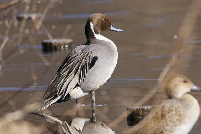 オナガガモが杭の上で気持ち良さそうに日向ぼっこ?